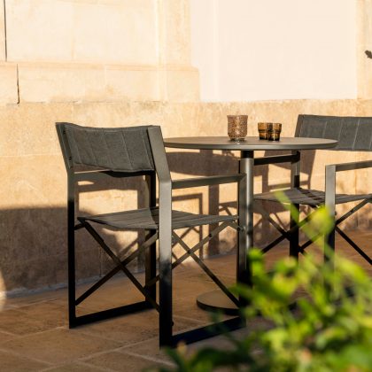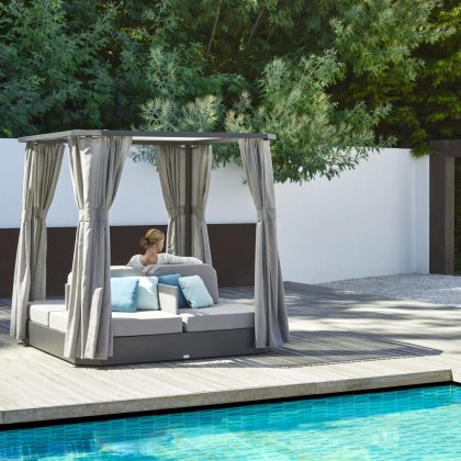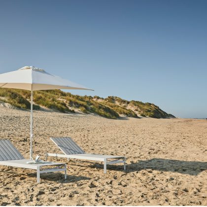 The robust frame of the lounge set is made of industrial aluminum. The cushions are equipped with Fast Dry Foam® which makes them weather resistant and dries quickly after a rain shower. The cushions are covered with Sunproof®, a premium outer fabric that is colorfast and easy to clean.