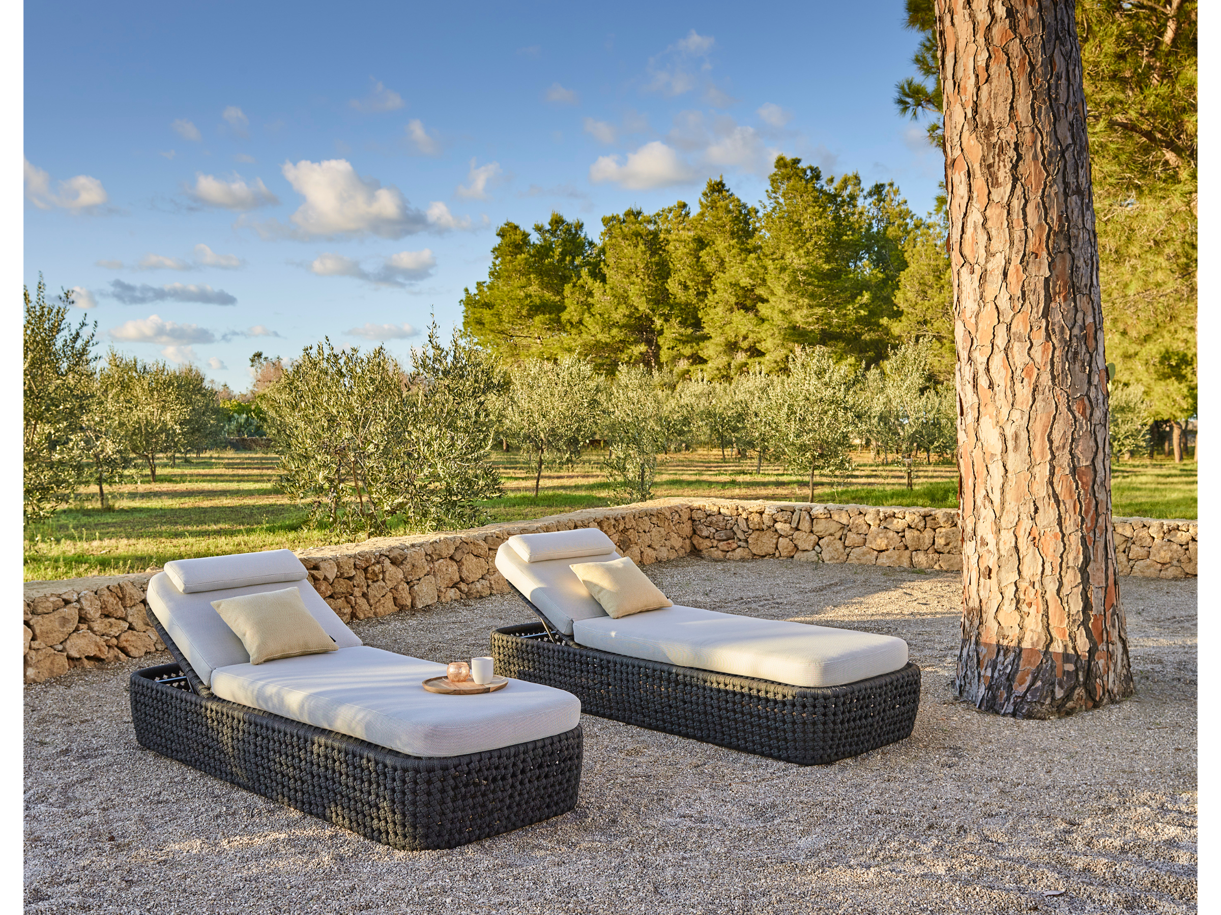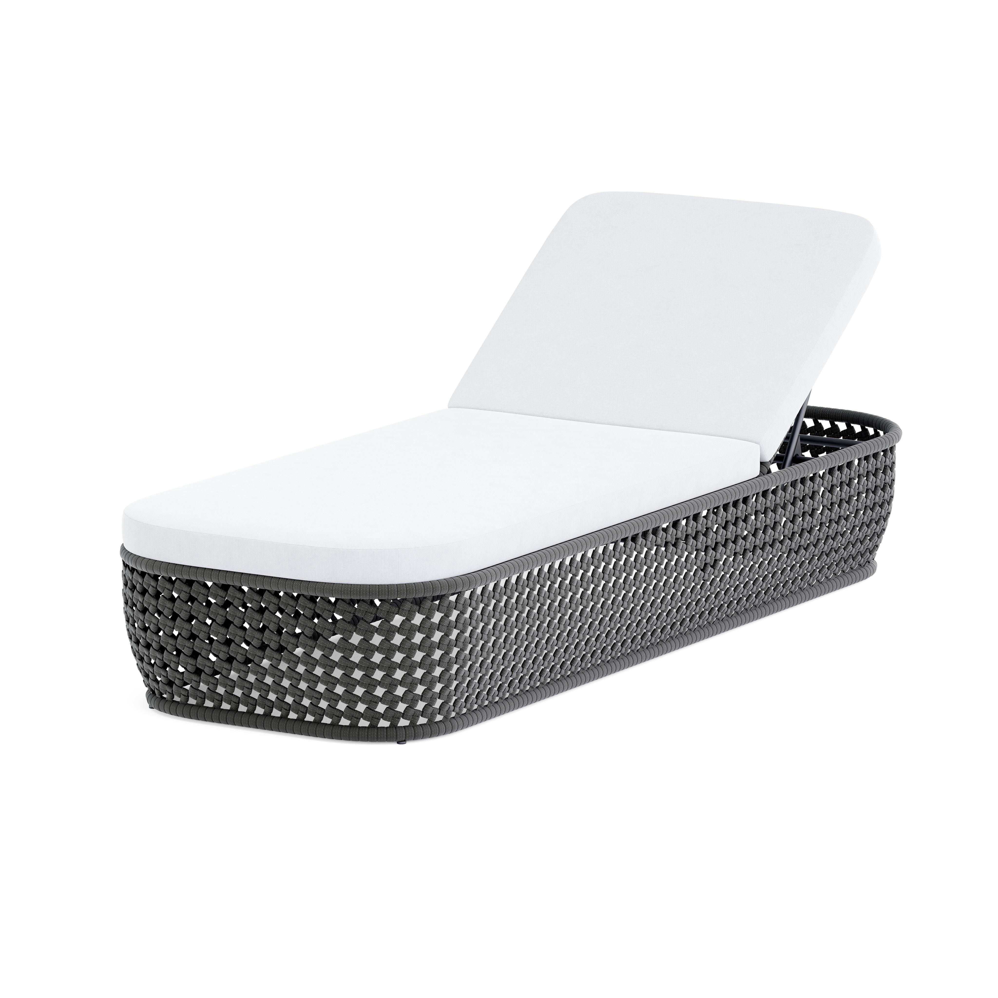 Deze sunlounger werd afgewerkt met een aluminium frame, antraciet handgeweven touw en quartz kleurige kussens.